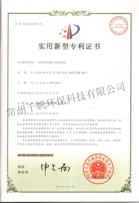 实用新型专利证书 一种活性炭废气吸附装置